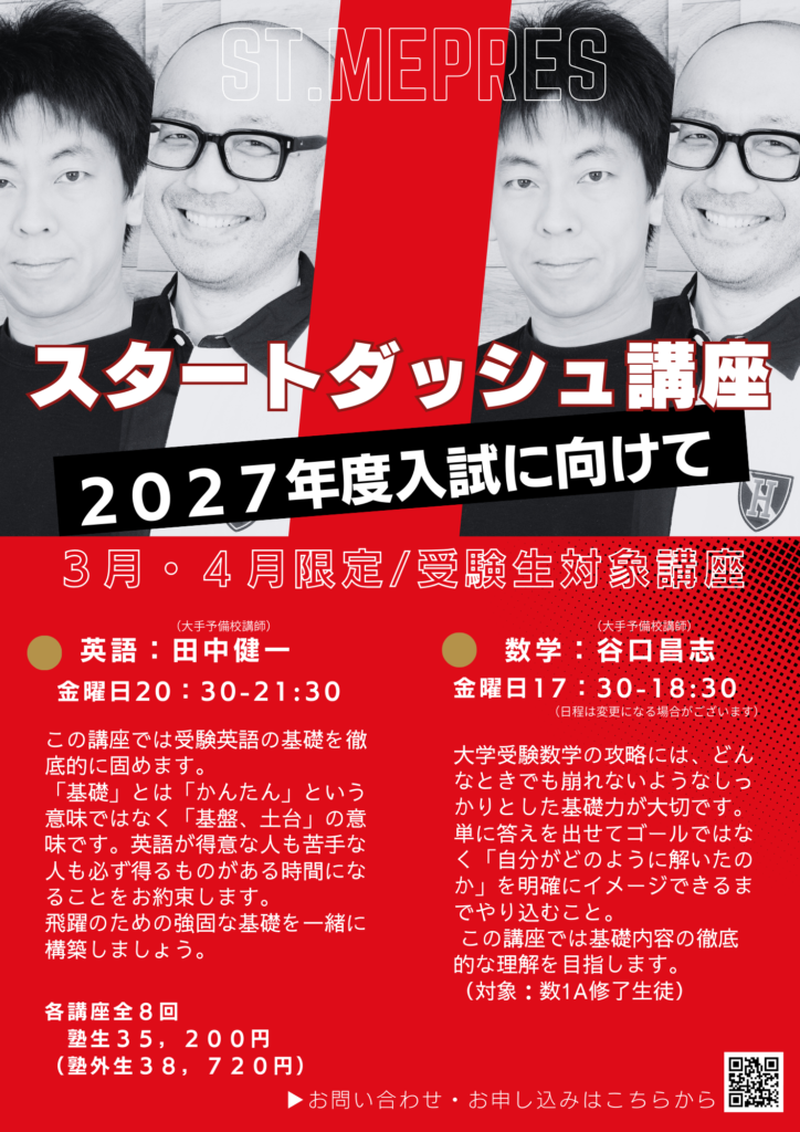 そのサポートの質を高いレベルに保つため2026年2月より全塾生数の上限を50名と定め、一人ひとりを手塩に掛けて育てるための教務体制のさらなる強化を目指し理系教科長(高田将史)・文系教科長(田中健一)を新設し、さらに総担任には私中野とともにに教務部長(田中健一兼任)が連携して当たることに致しました。この体制により塾生個々に最適の指導が行き届きますようにさらに努力致しますので、どうかなお一層のご期待とご支援を賜りますようお願い申し上げます。